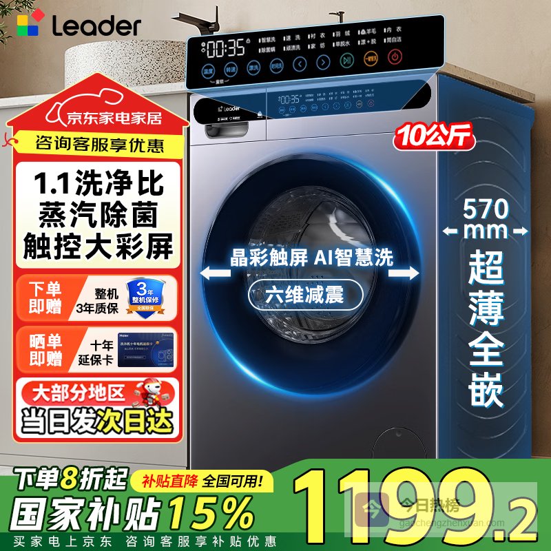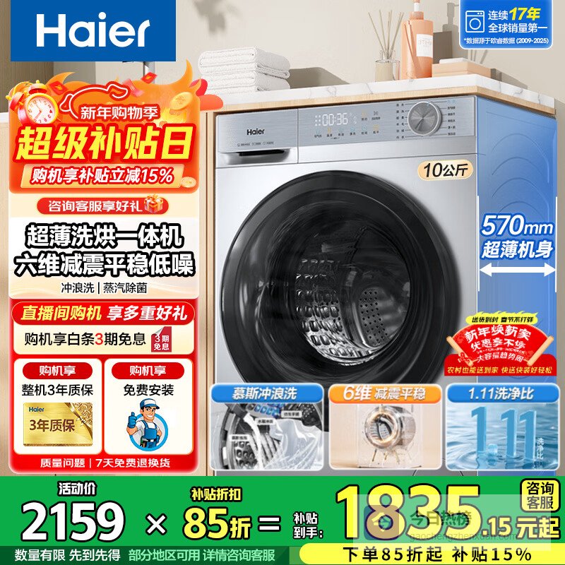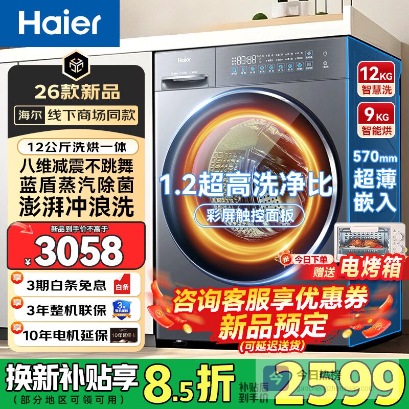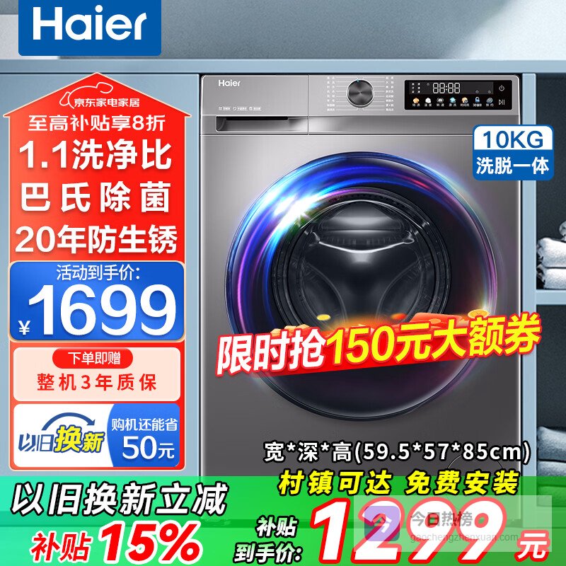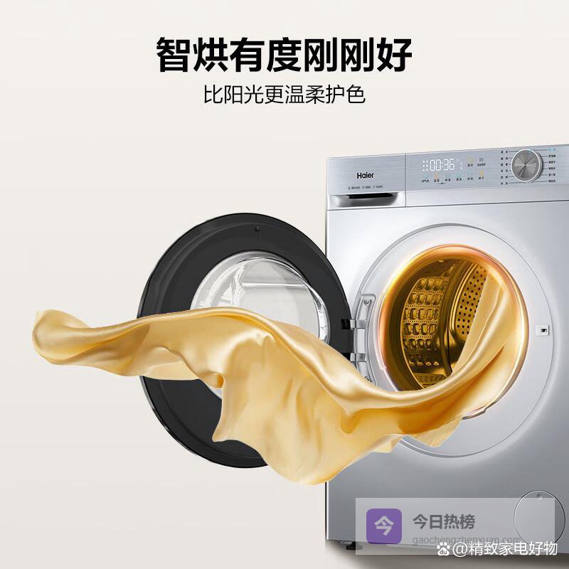 2、海尔洗烘一体机这款洗衣机真是贴心,洗烘一体设计,洗完直接烘干,告别阴雨天晾衣烦恼。10公斤大容量,一家人的衣物一次搞定,被罩、窗帘也能轻松洗。还有AI智慧洗,不用操心程序设置,它会根据衣物自动匹配,省心!