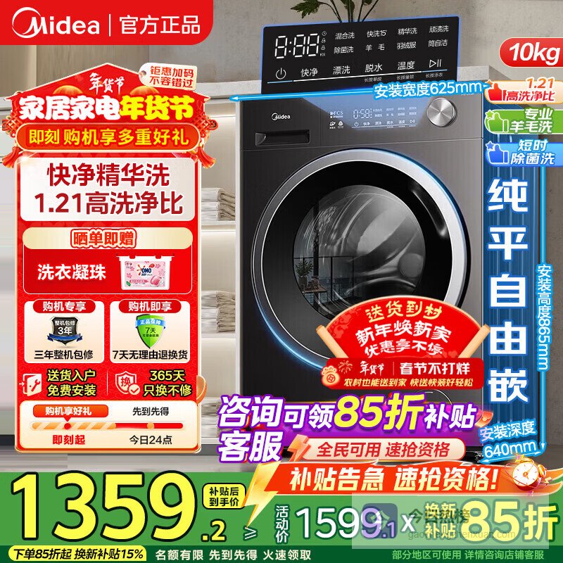 5、美的V36这款洗衣机型号选择很多,容量也挺全的,能满足不同人群的需求。它洗得也干净,洗净比达到了1.21,而且还有各种专业洗护程序,像羊毛、羽绒这些娇贵的面料也能放心交给它。万象环流的设计,据说能更好地去除毛发和各种污渍,真的很实用!