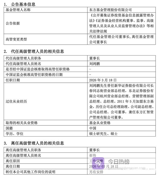 3月20日,东方基金管理股份有限公司(下称“东方基金”)发布公告称,经公司董事会审议通过,因工作调整,崔伟离任公司董事长一职,由公司总经理刘鸿鹏代任董事长。