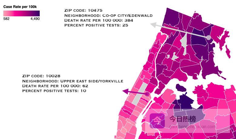 3.2 ► 一张图看懂“热码”与“冷码”纽约市公布的最新数据里,10475 邮编区(Co-op City/Edenwald)每 10 万人死亡 378 例,阳性率 29%;而 10028 邮编区(Upper East Side/Yorkville,杰奎琳·肯尼迪曾在此居住)死亡仅 62 例,阳性率 10%。同样的病毒,不同的结局,根源是教育资源、就业机会、食品超市、急救响应的“等级地图”。有人把这张差异比作地铁寿命图:从曼哈顿中城到南布朗克斯,每多坐一分钟地铁,预期寿命就减少十年。