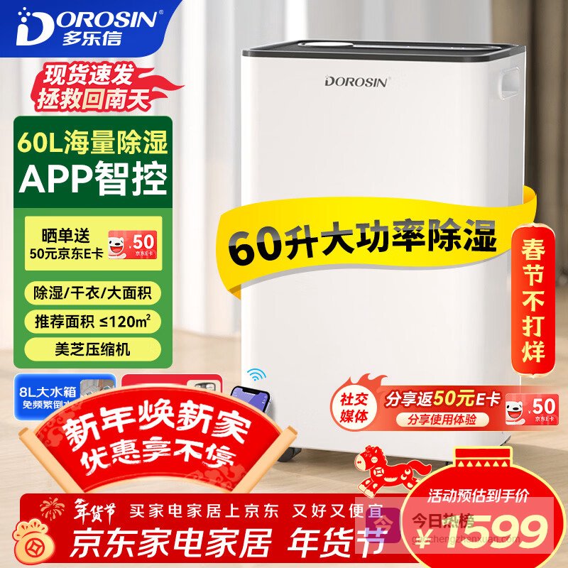 【京东自营】多乐信除湿机/抽湿机60升/天120㎡APP智控大功率别墅办公室地下室商业家用回南天吸湿¥