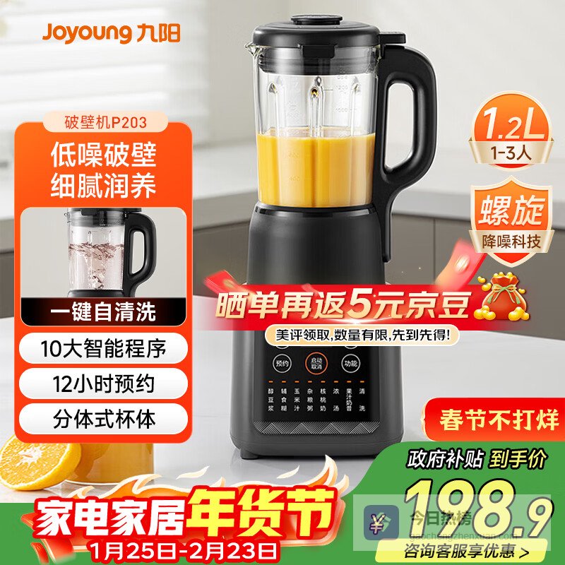 【京东自营】九阳家用轻音全自动1.2L多功能预约豆浆机2-3人榨汁机料理辅食机五谷杂粮破壁机P203¥