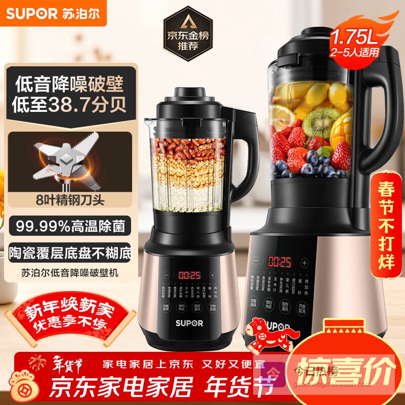 【京东自营】苏泊尔破壁机1.75L大容量家用多功能可预约辅食料理机加热免滤全自动豆浆机破冰碎冰榨汁机¥