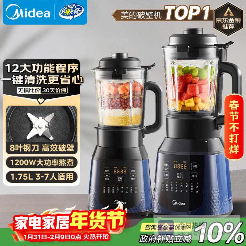 【京东自营】美的破壁机家用自清洗多功能全自动豆浆机1.75L预约加热榨汁辅食料理机3-5人金榜补贴M¥