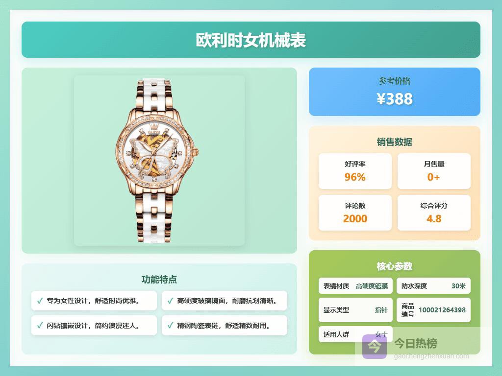 十、欧利时这款欧利时女机械表配备夜光大三针,夜光材料能吸收光线,黑暗中也能清楚读取时间。加上高硬度镀膜镜面,耐划耐磨,使用寿命还挺长。表盘采用白色设计,简约又不失优雅,适合日常搭配。