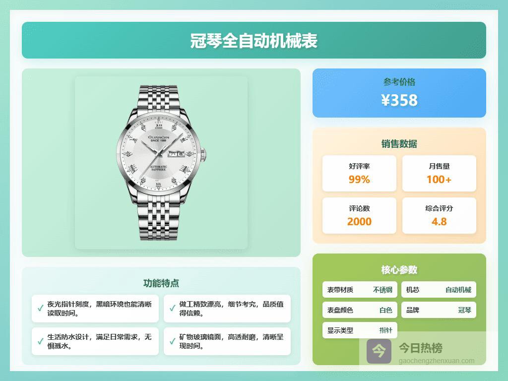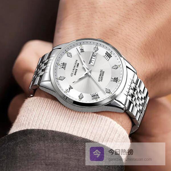 八、冠琴这款冠琴全自动机械表配备高性能全自动机械机芯,不需要手动上链,实测走时挺准,续航能力也还行。只要日常佩戴,自动会为机芯补充动力,几天不用戴都不影响。机芯稳定性不错,低故障率,适合日常使用。