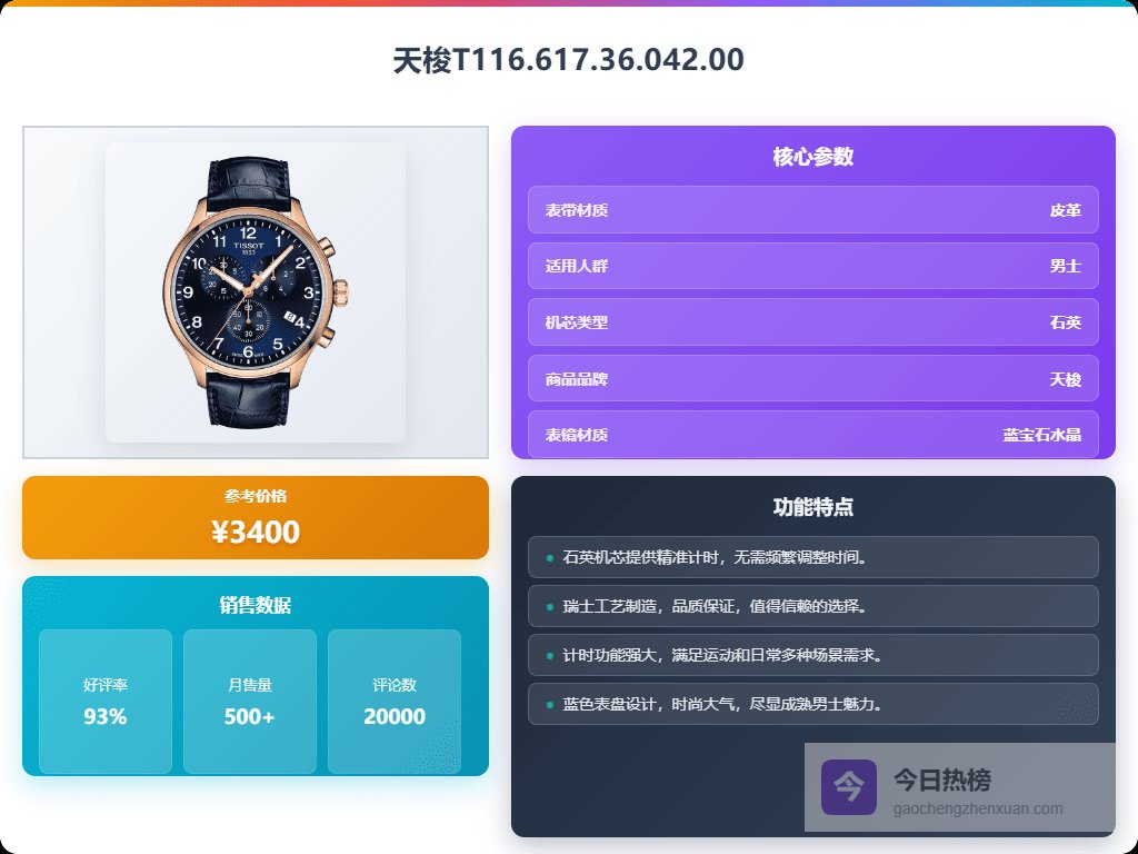 2026年瑞士腕表买哪个牌子好,这几款品牌值得入手一、天梭这款天梭T116.617.36.042.00采用精钢材质的表壳和中国制造的石英机芯,提供可靠的时间精确度。表盘直径超过43毫米,配备了日期显示和小三针设计,让你可以轻松掌握日期和时间。人工蓝宝石水晶玻璃既耐磨又清晰,减少划痕,保持良好的视觉效果。