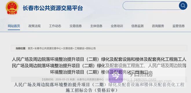 3月23日,长春市公共资源交易平台发布《人民广场及周边院落环境整治提升项目(二期)绿化及配套设施和楼体及配套亮化工程施工招标公告》,重点内容如下: