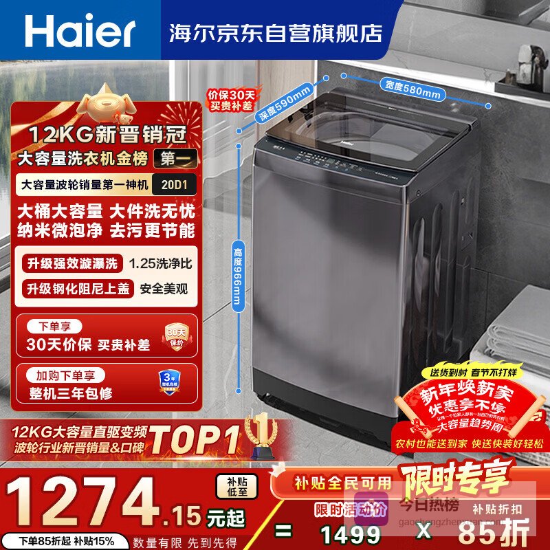 【京东自营】海尔全自动波轮洗衣机12KG大容量玻璃上盖家用家电国家补贴以旧换新XQB120-BZ20¥