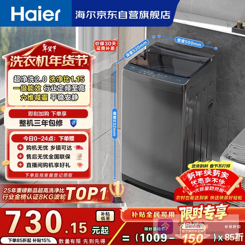 【京东自营】海尔全自动波轮洗衣机8KG小型家用宿舍出租房家电国家补贴以旧换新京东自营XQB80-Z1¥