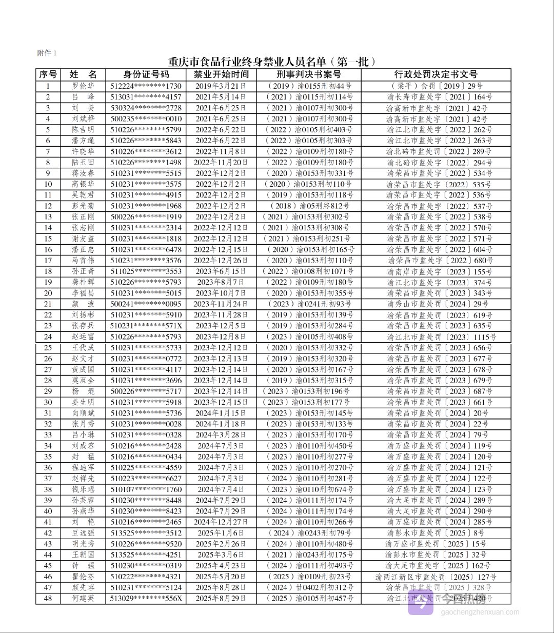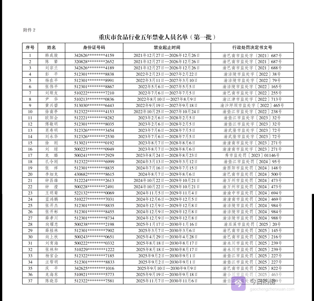 重庆市食品行业五年禁业人员名单