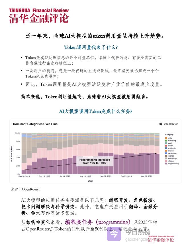 AI大模型调用Token完成什么任务?AI大模型的应用任务主要涵盖以下几类:编程开发、角色扮演、技术问题解决与科学研究。此外,它也广泛应用于翻译、金融分析、学术写作等诸多领域。从结构性变化来看,编程类任务(programming)从2025年初占OpenRouter总Token的11%飙升至50%以上,增幅最为显著。