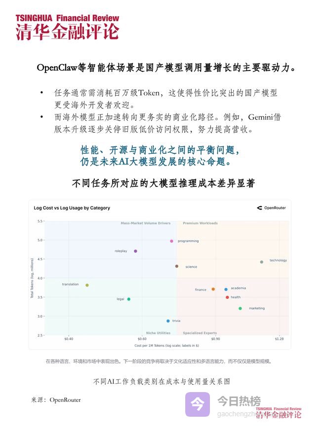 近一年来,全球AI大模型的token调用量呈持续上升趋势,OpenClaw等智能体场景是国产模型调用量增长的主要驱动力。任务通常需消耗百万级Token,这使得性价比突出的国产模型更受海外开发者欢迎。而海外模型正加速转向更务实的商业化路径。例如,Gemini借版本升级逐步关停旧版低价访问权限,努力提高营收。