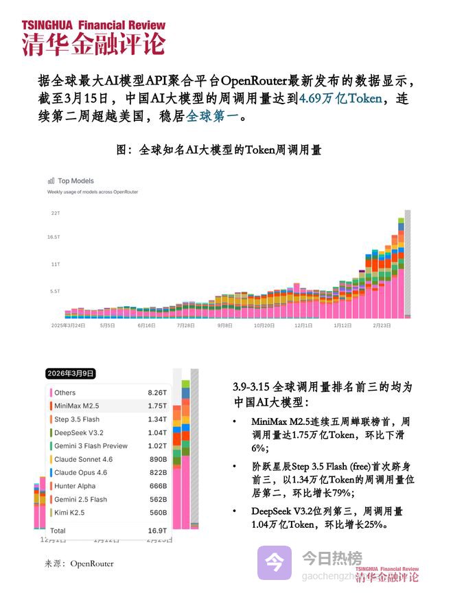 据全球最大AI模型API聚合平台OpenRouter最新发布的数据显示,截至3月15日,中国AI大模型的周调用量达到4.69万亿Token,连续第二周超越美国,稳居全球第一。