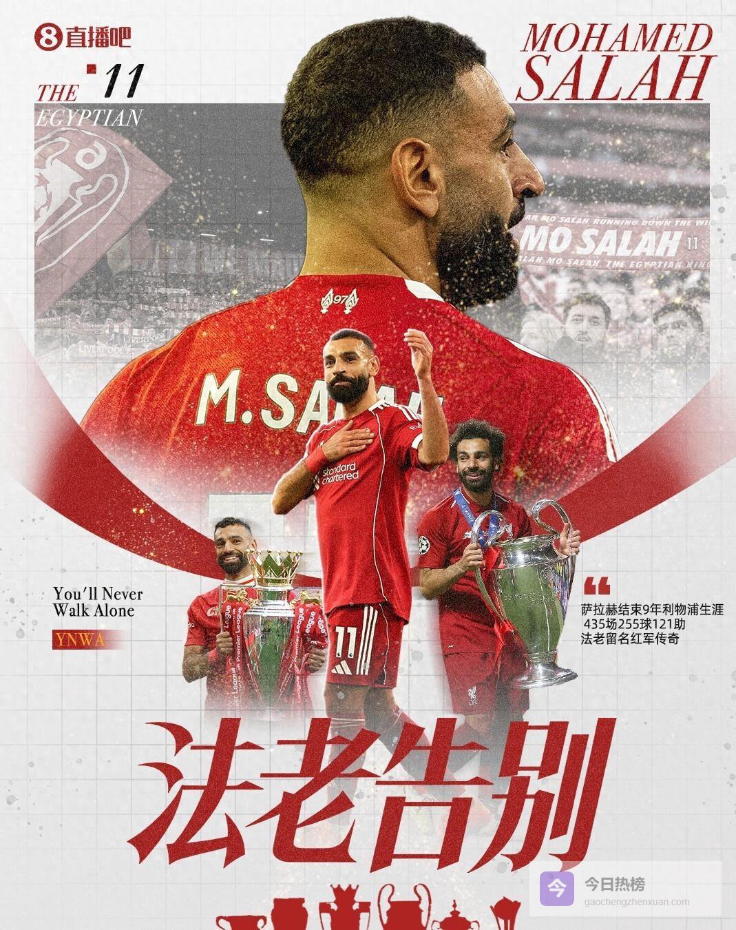 九载红军生涯,萨拉赫留下了不可磨灭的印记。 他总计为利物浦出战435场比赛,攻入255球并送出122次助攻,高居队史射手榜第三位。 他帮助球队赢得了包括欧冠和英超在内的九座重要冠军奖杯。