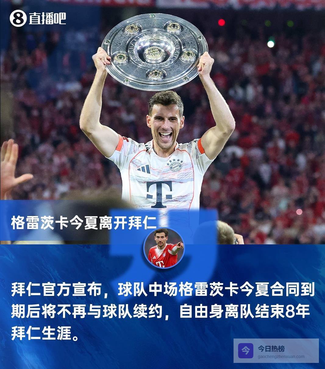 拜仁慕尼黑的中场也将迎来变动。 31岁的德国国脚莱昂·格雷茨卡已确定在合同到期后自由离队,结束八年的拜仁生涯。 拜仁体育总监弗罗因德已官方确认了这一决定。