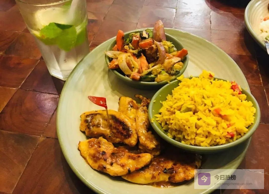 鸡胸腌过香料后炭烤,外皮焦脆、肉汁锁在纤维里;再蘸旁边那罐绿色酱汁—— 酸辣中带椰浆香。