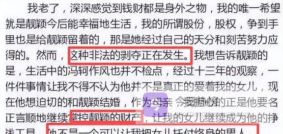 张靓颖的妈妈其实早就看穿了冯柯的真面目。就在两人结婚那一年,张靓颖的妈妈张桂英突然发了篇长文,把冯柯骂了个狗血淋头,说他转移财产,还控制自己的女儿。