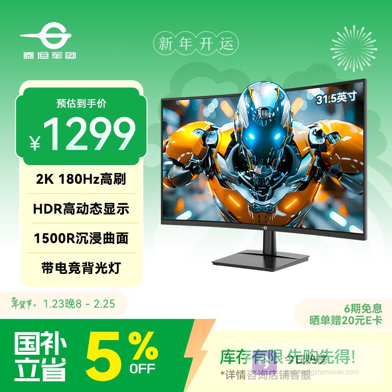 【京东自营】泰坦军团31.5英寸2K180Hz人体工学支架HDR高动态显示带电竞背光灯1500R曲面¥