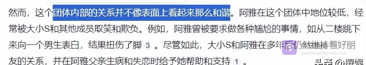 有网友翻出旧账,说华冈艺校时期,阿雅就经常被大小S捉弄。她自己上节目说过,被姐妹俩怂恿从二楼跳下去向男生告白,结果手都摔伤了。