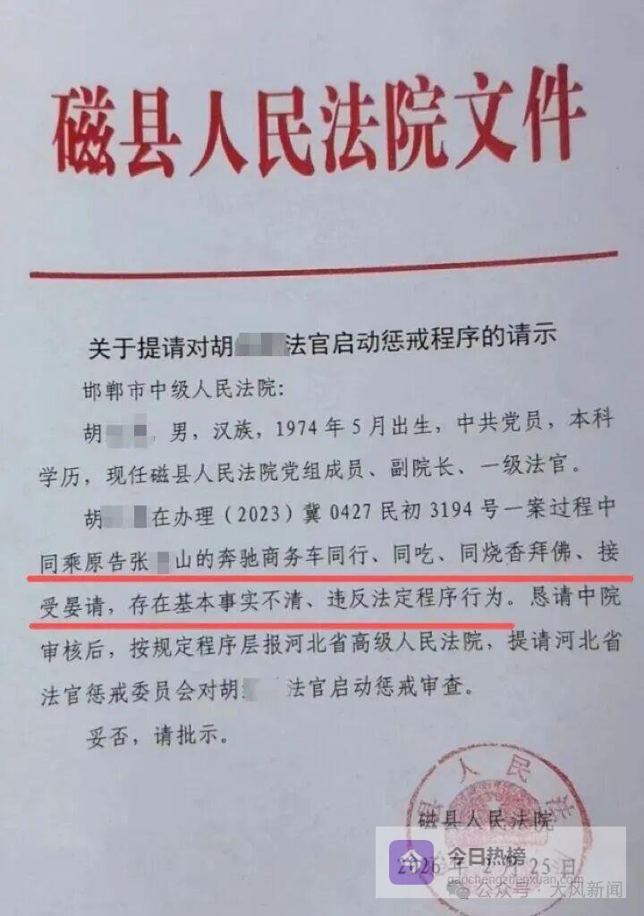 近日,一名网友通过短视频平台发布了一份《关于提请对胡某法官启动惩戒程序的请示》,其中提及,胡某,男,1974年5月生人,现任磁县法院党组成员、副院长、一级法官。胡某在办理(2023)冀0427民初3194号一案过程中,同乘原告张某山的奔驰商务车同行、同吃、同烧香拜佛、接受宴请,存在基本事实不清、违反法定程序行为。恳请邯郸市中院审核后,按规定程序层报河北省高院,提请河北省法官惩戒委员会,对胡某法官启动惩戒审查。该“请示”落款“磁县人民法院”,日期为2026年2月25日。