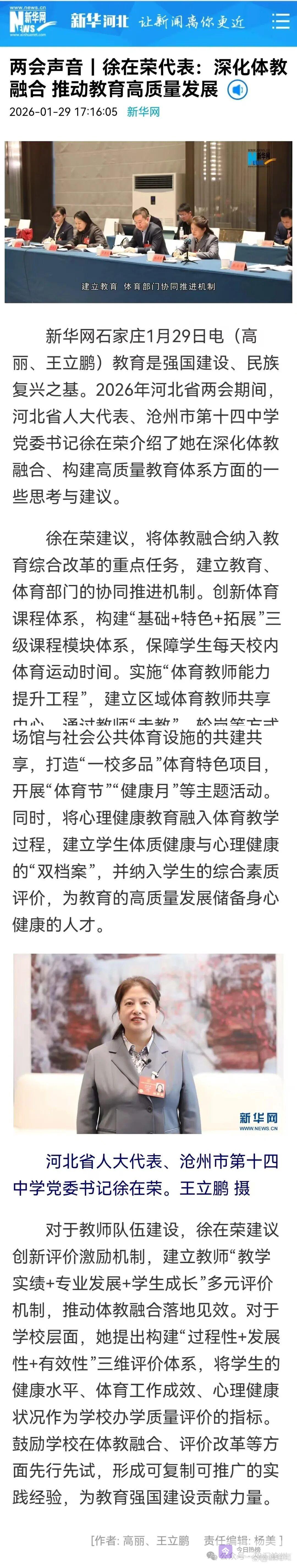 2026年河北两会期间,河北省人大代表、沧州市第十四中学党委书记徐在荣的一席发言,如春风拂面,不仅道出了基层教育工作者的心声,更点燃了无数家长对“健康而有质量的教育”的期待。在接受新华网专访时,她以一线实践者的视角,描绘了一幅体教融合、身心并育的教育新蓝图——这不仅是政策建议,更是对当下教育痛点的精准回应。