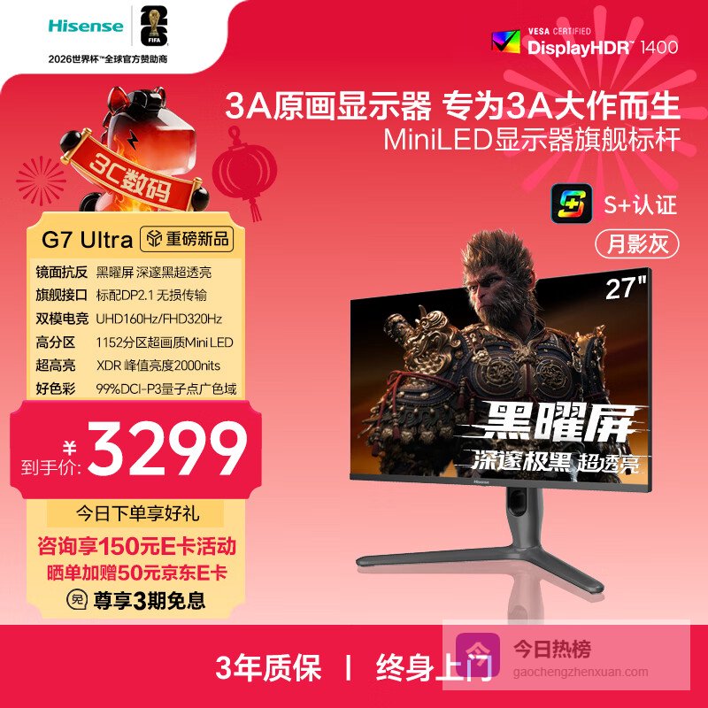 海信G7 Ultra代表了一条不同的高端技术路径——MiniLED。它拥有27英寸4K分辨率,并通过1152分区的MiniLED背光实现了极高的亮度和精准的控光,HDR效果惊人。同时,它创新地提供了双模刷新率:在DP2.1接口下支持4K 160Hz,在特定模式下可切换至1080P 320Hz。这意味着你可以在享受3A大作的极致画质和体验电竞高帧率之间灵活切换,一机两用,非常适合不想在画质和流畅度上做选择题的多元游戏玩家。