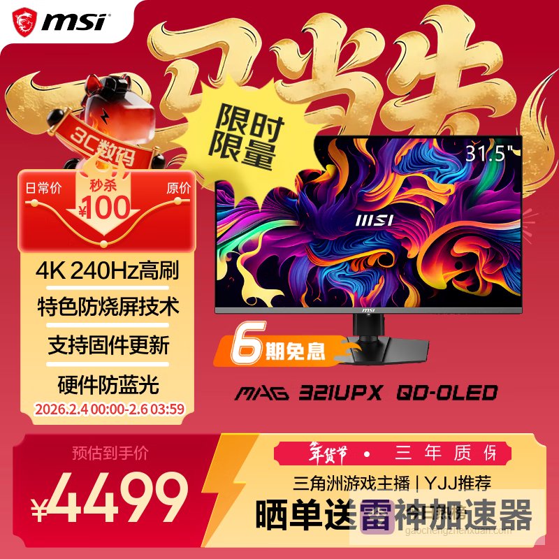 微星(MSI)流光MAG 321UPX QD-OLED 31.5英寸4K240Hz显示器 量子点QD-OLED 0.03ms HDR400游戏电竞显示屏¥