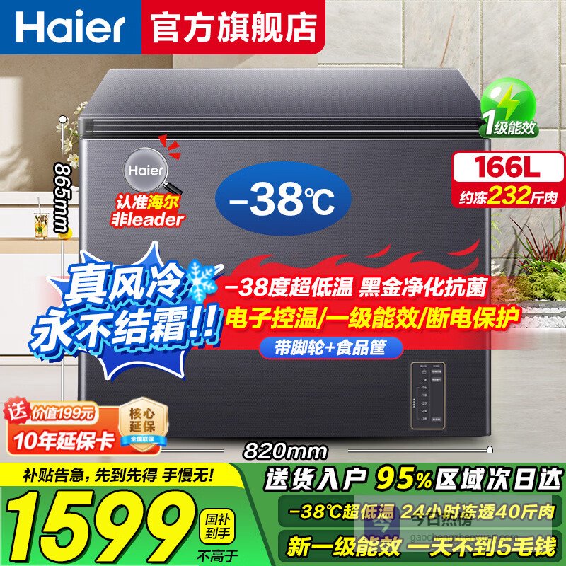 海尔(Haier)冰柜家用 卧式小冷柜风冷无霜商用专业超低温速冻一级节能省电冷藏冷冻切换单温冷柜 166升 |-38℃超低温+风冷无霜+黑金净化¥