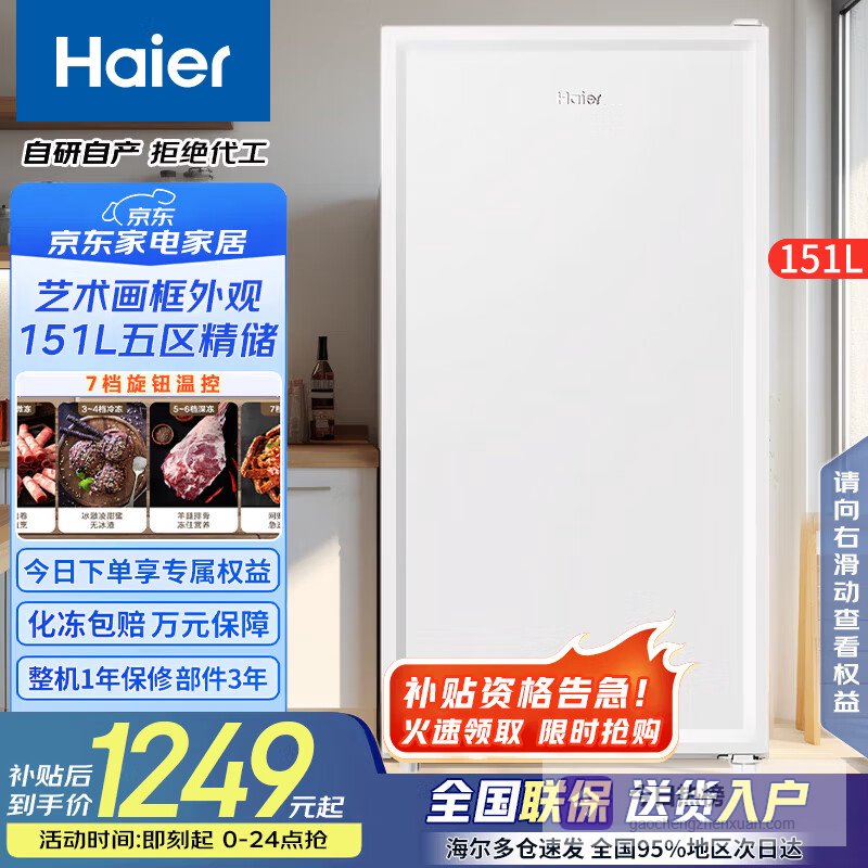 海尔(Haier)冰柜家用 立式新一级节能抽屉式小冷柜 深冷速冻海鲜冷冻柜冷藏小冰柜 152升 +风冷无霜+黑金净化抗菌+电子控温¥