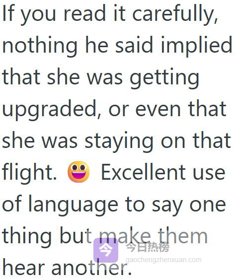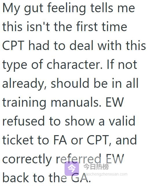 我: 你需要和机组人员处理这个问题。我是乘客。 EW 气冲冲地走开,像个恼怒的德洛丽丝·乌姆里奇,然后带着空乘人员回来了 空乘: 早上好,机长!请问我可以看一下您的登机牌吗? 我: 当然可以。(我把登机牌递给她) 空乘: 女士,那是他的座位,他已经为这个座位付过钱了。 EW: 那就把他赶下去吧,亲爱的。我已经升级到头等舱,那是我的座位。