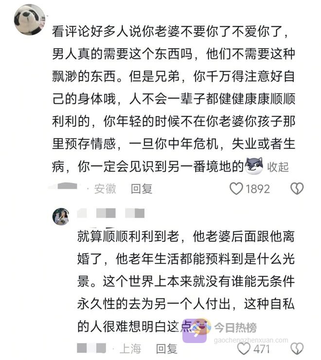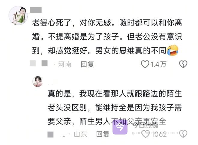 我觉得不一定是要离婚,有一部分原因就是孩子大了,可以替代很大一部分伴侣的功能。比如说逛街啦,看电影啦,吃饭啦。反正情绪价值都能提供,老公就无所谓了。