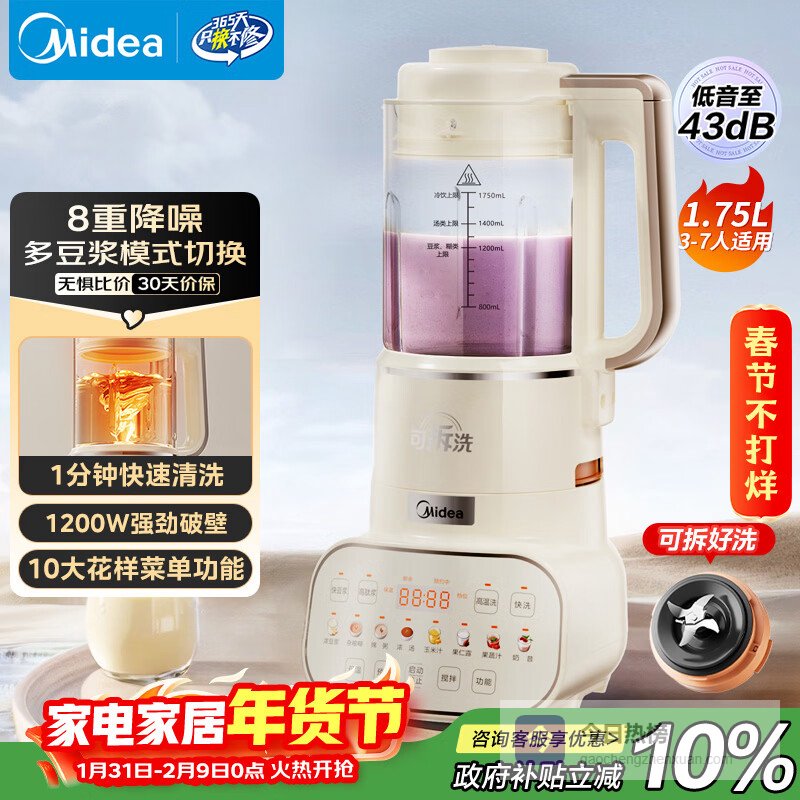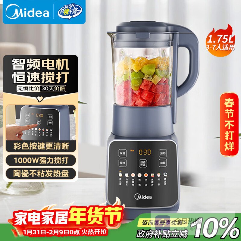 美的(Midea)破壁机家用 1.75L全自动免煮多功能早餐豆浆机 预约加热料理辅食机榨果汁机国家补贴 PB10G2-061¥