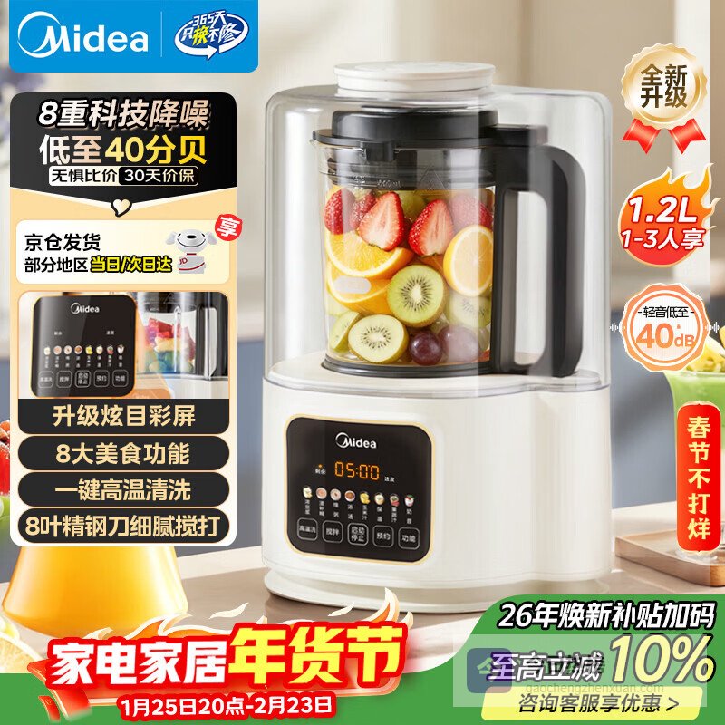 美的(Midea)破壁机家用豆浆机全自动高温洗1.2L小型2-3人免滤料理榨汁机辅食机3-4人五谷杂粮MJ-PB40ST10年货¥