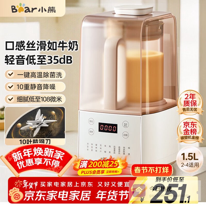 2、小熊PBJ-F01G1这款小熊破壁机,容量足足有1.5升,够一家人喝啦。它不仅能做米糊、五谷杂粮,还能榨果汁、打豆浆,功能挺全面的。更赞的是它有预约功能,晚上设置好,早上就能喝到热乎乎的饮品,特别适合我这种懒人!