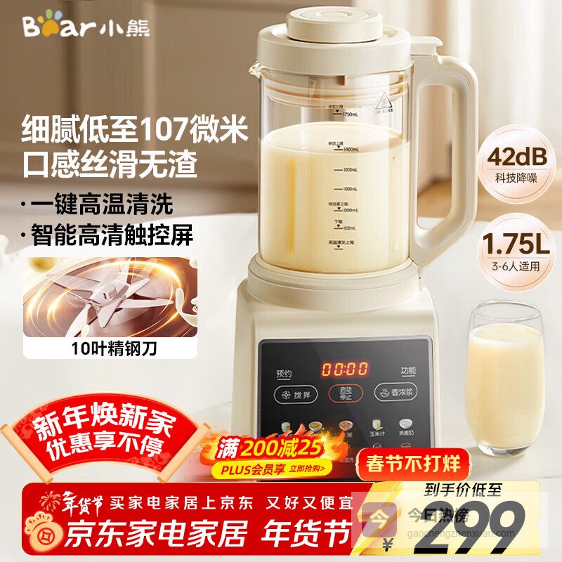 小熊(Bear)破壁机家用多功能降噪预约全自动免过滤豆浆机榨汁机辅食料理机1.75升大容量3-5人G12H1¥