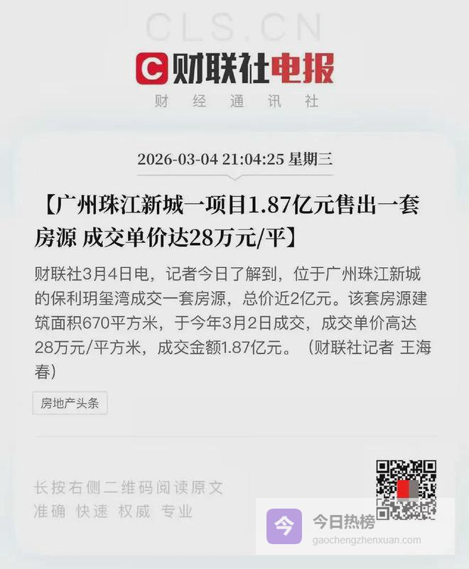 在3月初,一套楼王单位更是以总价约1.87亿元、单价约28万/㎡成交,捅破广州豪宅天花板!