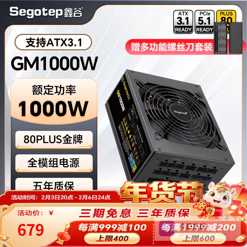 鑫谷(segotep) 电源650W/750W/850W/1000WGM系列金牌全模组 台式机50系组装电脑电源ATX3.1模组 GM1000W金牌全模组电源【支持ATX3.1】¥
