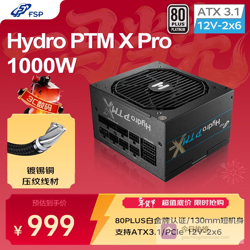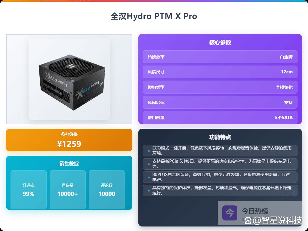 3、全汉Hydro PTM X Pro1000W全汉Hydro PTM X Pro 1000W电源,1000W额定功率给力!而且它通过了80PLUS白金牌认证,转换效率高,能省下不少电费。更棒的是,它支持最新的英特尔ATX3.1规范和PCIe 5.1标准,现在用或者以后升级平台,都能稳稳Hold住。