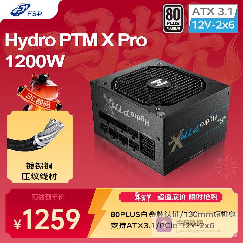 全汉(FSP)Hydro PTM X Pro1200W白金牌全模组电源(ATX3.1/12V-2x6/130mm短机身/全压纹线)¥
