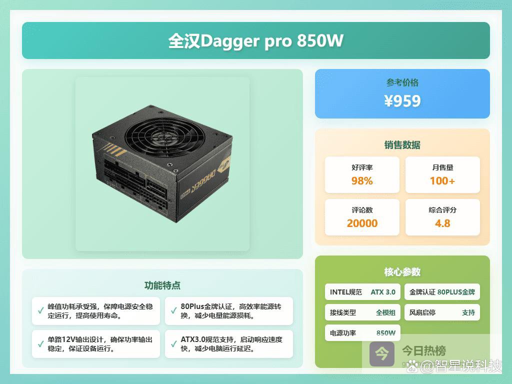 5、全汉Dagger pro 850W全汉SDA2-850电源真是小身材大能量!作为一款SFX电源,它体积小巧,但拥有850W的强劲输出,轻松应对高端配置。全模组化设计让你的机箱内部更加整洁,理线不再是难题。而且它还支持英特尔ATX3.0规范,启动和响应速度更快,减少了延迟,难怪有老用户用了全汉7年的电源坏了后,换了好几个牌子都不满意,最后还是选择回归全汉!
