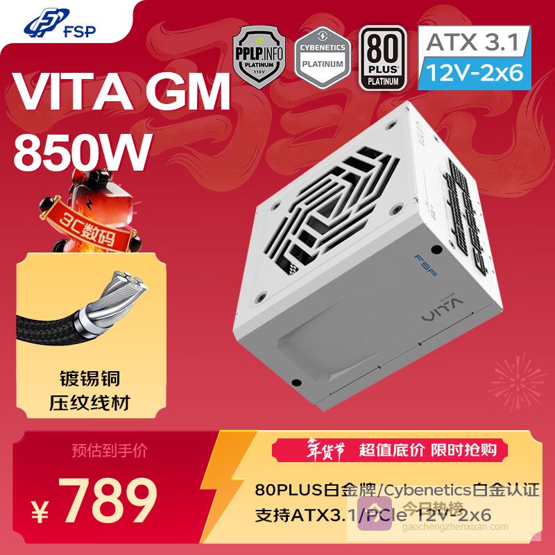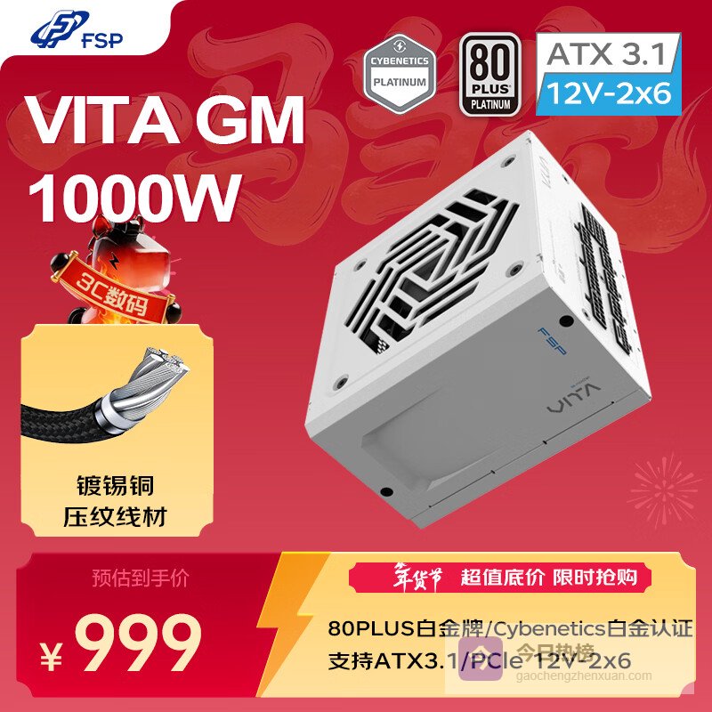 2、全汉VITA GM全汉VITA GM 1000W雪装版白金牌全模组电源,通过80PLUS白金牌认证,转化效率高达92%。符合ATX 3.1规范,启动嗖嗖的,再也不用干等着开机啦!全模组设计,走线清爽,看着心情都好。还有老用户说,之前用过全汉的,稳定安静,电压稳得很,再也不怕黑屏啦!