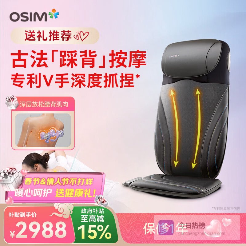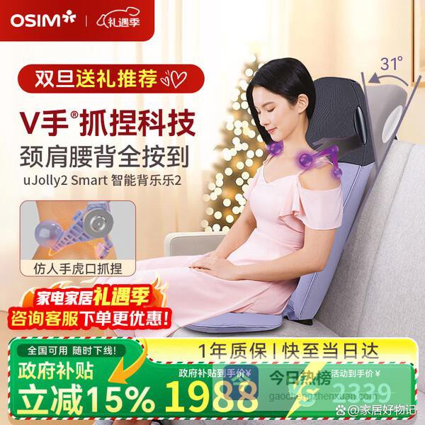 4、傲胜OS-2233这款OSIM傲胜OS-2233按摩器采用了仿人手揉捏技术,结合专利V手工艺,能够模拟真实手法,精准控制力度和节奏,带来深层的肌肉放松。它适用于全身多部位,特别是肩颈和腰背,能有效缓解肌肉紧绷和酸痛,让按摩体验更加贴合人体需求。