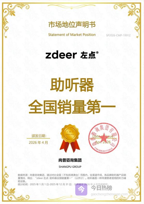 近日,专注家庭健康科技品牌zdeer左点荣获权威市场研究机构尚普咨询集团——“中国助听器连续三年全网销量第一”及“助听器全国销量第一”认证。此次认证基于尚普咨询对中国助听器市场的系统性调研,数据覆盖线上全渠道及线下实体渠道,综合考量销量、市场占有率等核心指标。