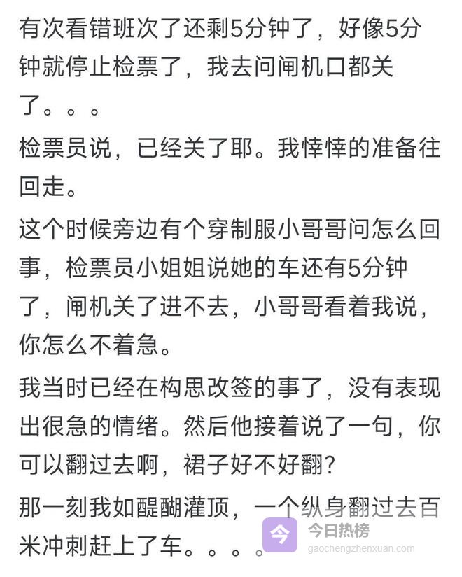 我那一次就是在苏州还是上海的地铁时间比预计的时间长了,我没赶上车,当时我到安检口的时候已经停止安检了,而且距离安检时间过了两分钟。我去的时候那个人说应该来不及了吧,然后那个女孩儿帮我把门刷开了,说你赶紧去看看,不行你再上来。我就提着箱子光速往下冲,然后我前面有一对情侣,那个情侣的男的先往下跑跑下去了,把车拦了一下,他上车跟那个关门的人说了一下。关门的人等了我们两分钟,然后我们就都上去了。