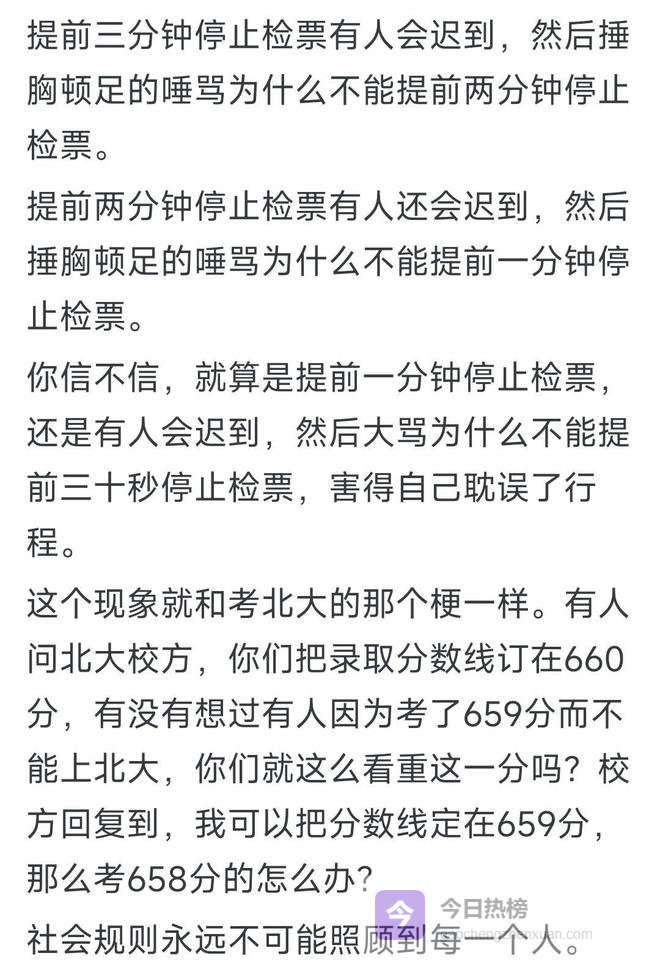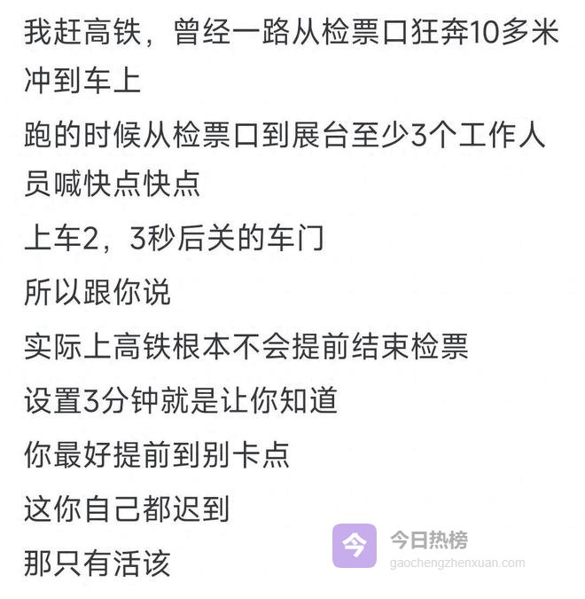 今日话题:为什么高铁提前三分钟停止检票?接下来小编就带领大家来看看,网友们是怎么看待这个问题的。
