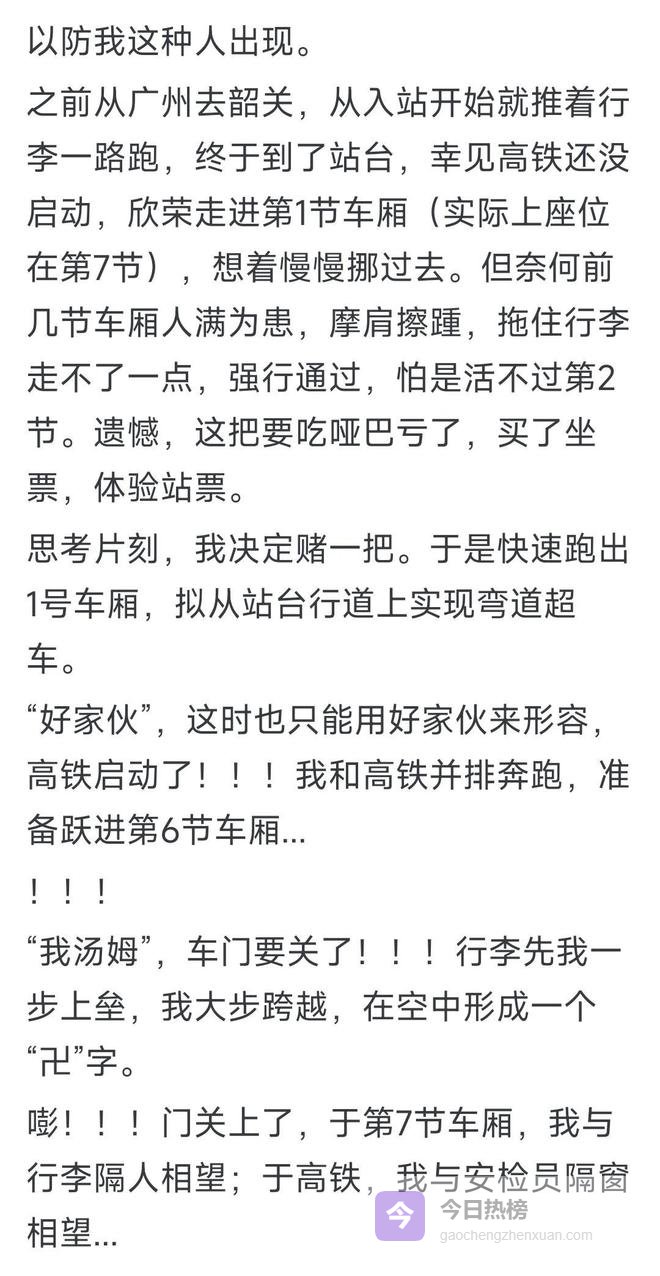 10多年前去上海,中午的返程杭州坐飞机,一早在当地谋生的同学带着去车站寄存了行李,带我们出去玩一上午,提前20分钟到的车站,去寄存处找不到行李了!花了10分钟一顿查,最后寄存处问了一句“你们是不是寄存在另外一个了”。真的,三个人像疯子似的边打听路线边狂奔,从车站这头跑到那头,取完了狂奔进站,到了检票口是空的,就检票员在那看见我们就问是不是去杭州的,我们答应了,对方说快进去,全车就等你们了,我还把行李放安检传送带上过了一遍,连安检员都喊我你还安检个啥。看见车了,就我那车厢门还开着,两个乘务员老远喊快跑,前脚上车后门就关了,我们一边往里走一边给全车人赔不是。