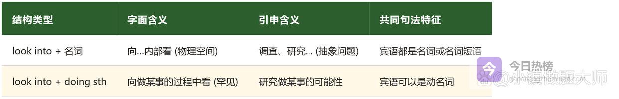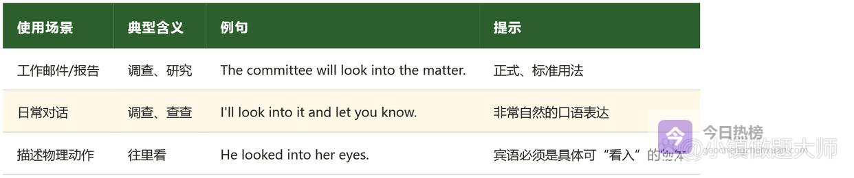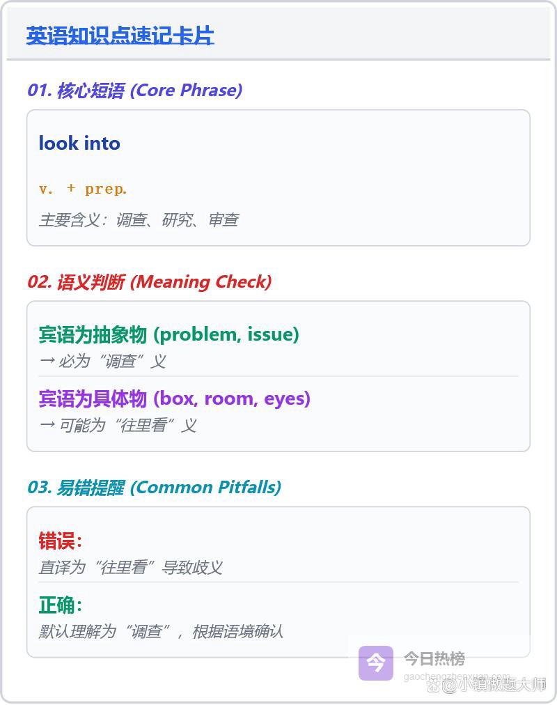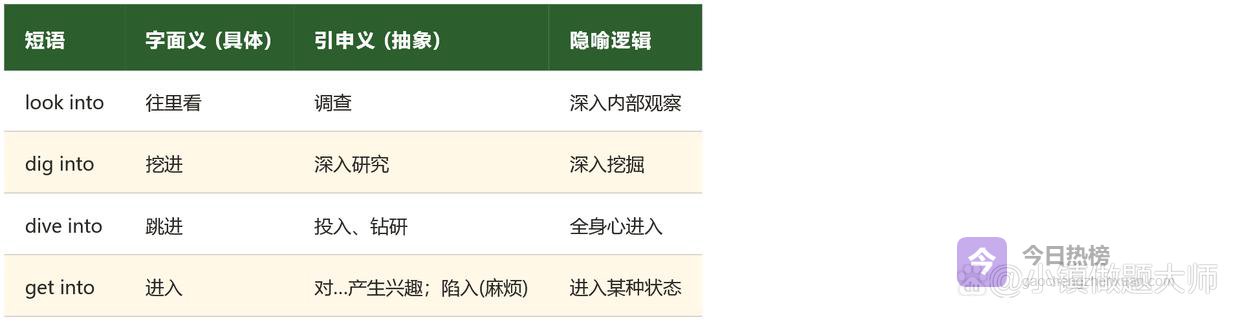 【重点】“Look into”的语义重心已从“看”的动作,转移到“深入探究”的过程。这是英语短语动词的典型特征:整体意义大于部分之和。掌握它,标志着从依赖字典翻译到理解语言文化的进步。