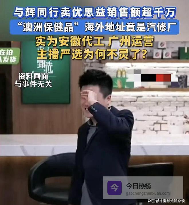 号称墨尔本原装的优思益,包装地址竟是汽修厂,实际由安徽工厂代工。成本几十元,包装成进口货卖三四百,溢价超5倍。更离谱的是,这款主打护眼的"保健品",连国家强制的"蓝帽子"认证都没有,纯属普通食品非法宣传功效。这场骗局里,董宇辉"与辉同行"直播间成核心帮凶,单场销量破10万单。粉丝冲著他"严选"人设买单,殊不知团队连产地、资质都没核实。此前他多次强调"产品上播前10天试吃、全项检测",如今看来全是空话。