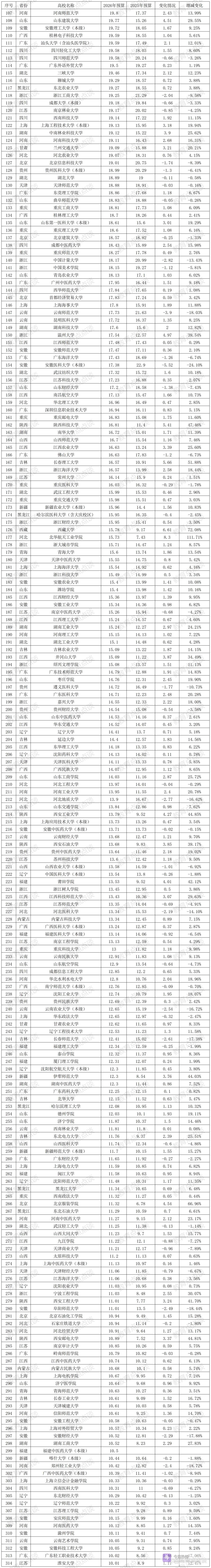 39-30亿共16所:福州大学38.23亿、广东工业大学37.12亿、华南农业大学36.08亿、华南师范大学34.69亿、广州大学33.59亿、深圳职业技术大学33.07亿、扬州大学(本部)32.33亿、广西大学32.28亿、杭州师范大学32.18亿、浙江师范大学31.86亿、江汉大学31.1亿、太原理工大学31.02亿、山东农业大学30.64亿、新疆大学(本级)30.47亿、浙江理工大学30.18亿、西安理工大学30.05亿。